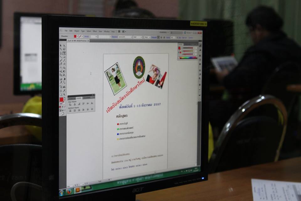 ศูนย์พัฒนาทักษะและการเรียนรู้ ICT แม่ฮ่องสอนอบรมหลักสูตรการสร้างงานกราฟิกด้วย Adobe Illustrator ระหว่างวันที่ 1 - 3 ธันวาคม 2557 เวลา 17.00 - 21.00น. ณ ศูนย์พัฒนาทักษะและการเรียนรู้ ICT แม่ฮ่องสอน วิทยากรโดยอาจารย์เอมอร ลิ้มวัฒนา ผู้ช่วยผู้อำนวยการศูนย์ หลักสูตรนี้เหมาะสำหรับผู้สนใจวาดภาพด้วยรูปทรงเลขาคณิต การวาดภาพด้วยรูปทรงอิสระ การใส่กราฟิกตัวอักษร การจัดวางภาพและองค์ประกอบ ต่างๆสามารถนำไปสร้างสื่อโฆษณา ใบปลิวหรือไวนิล อื่นๆได้