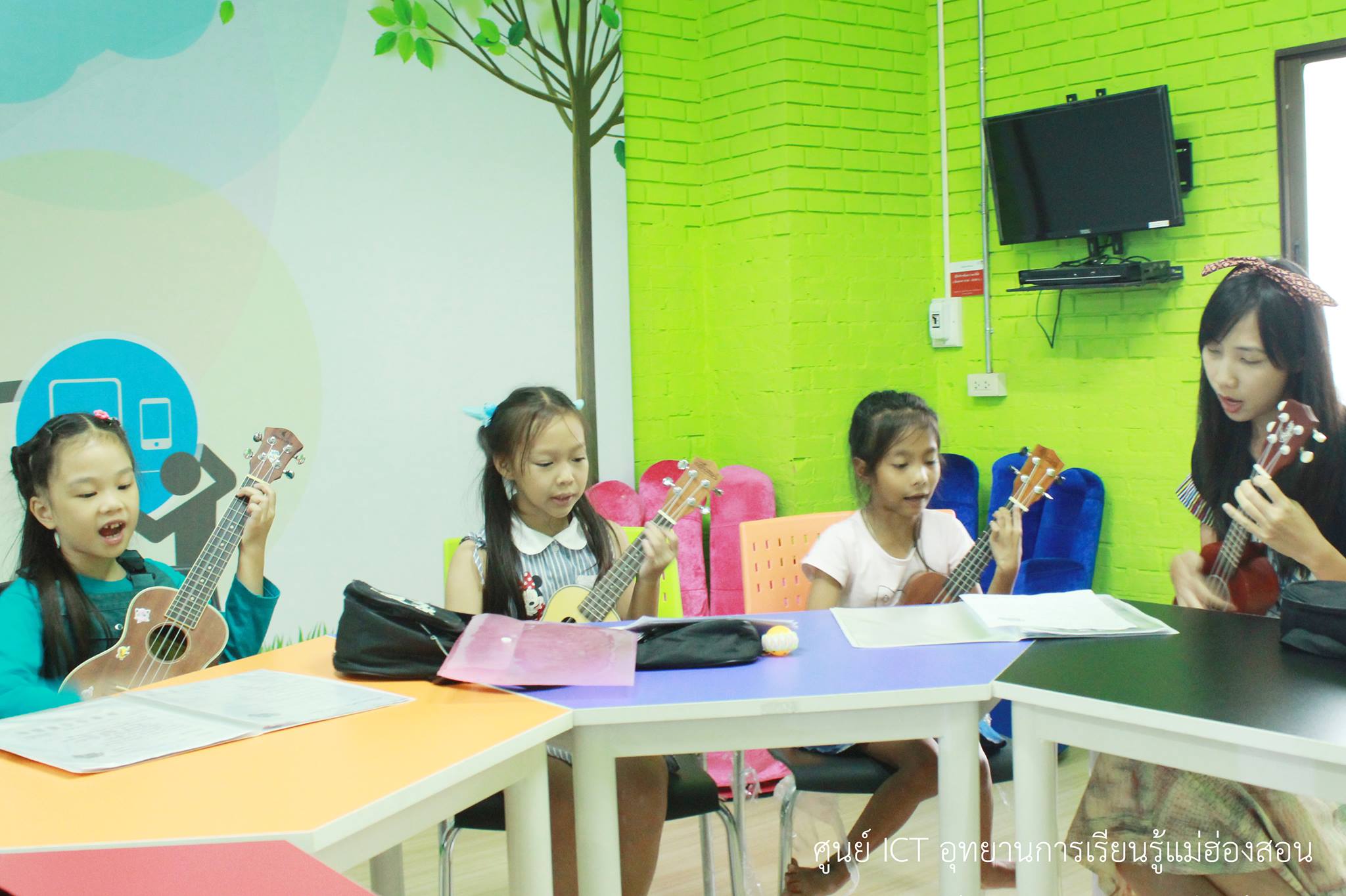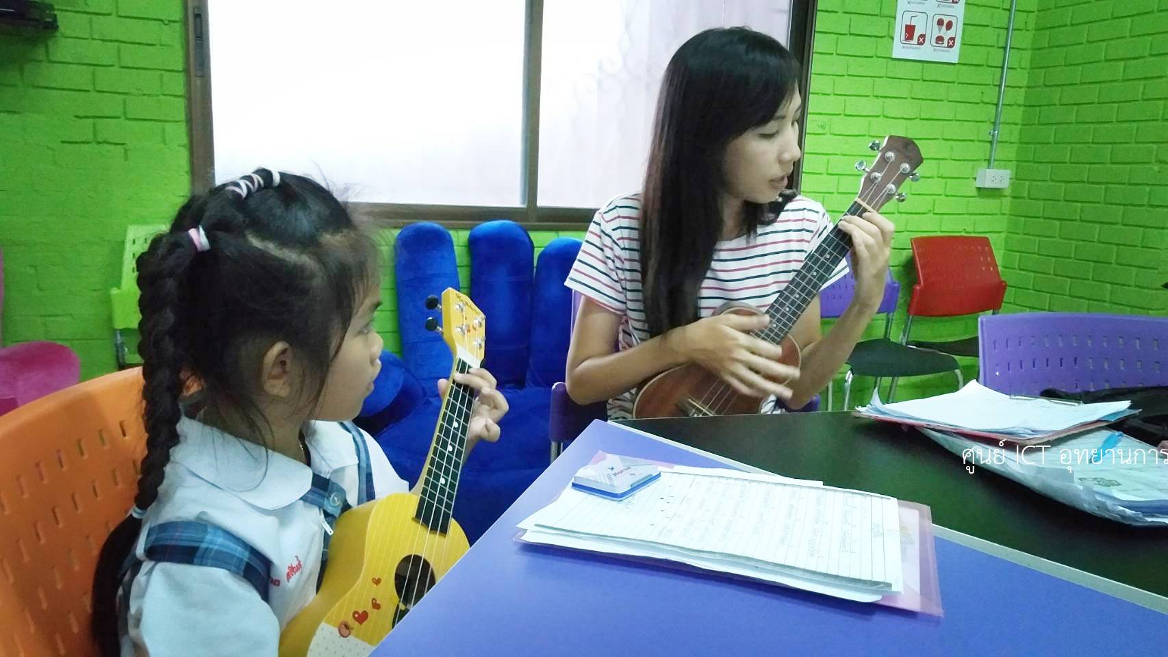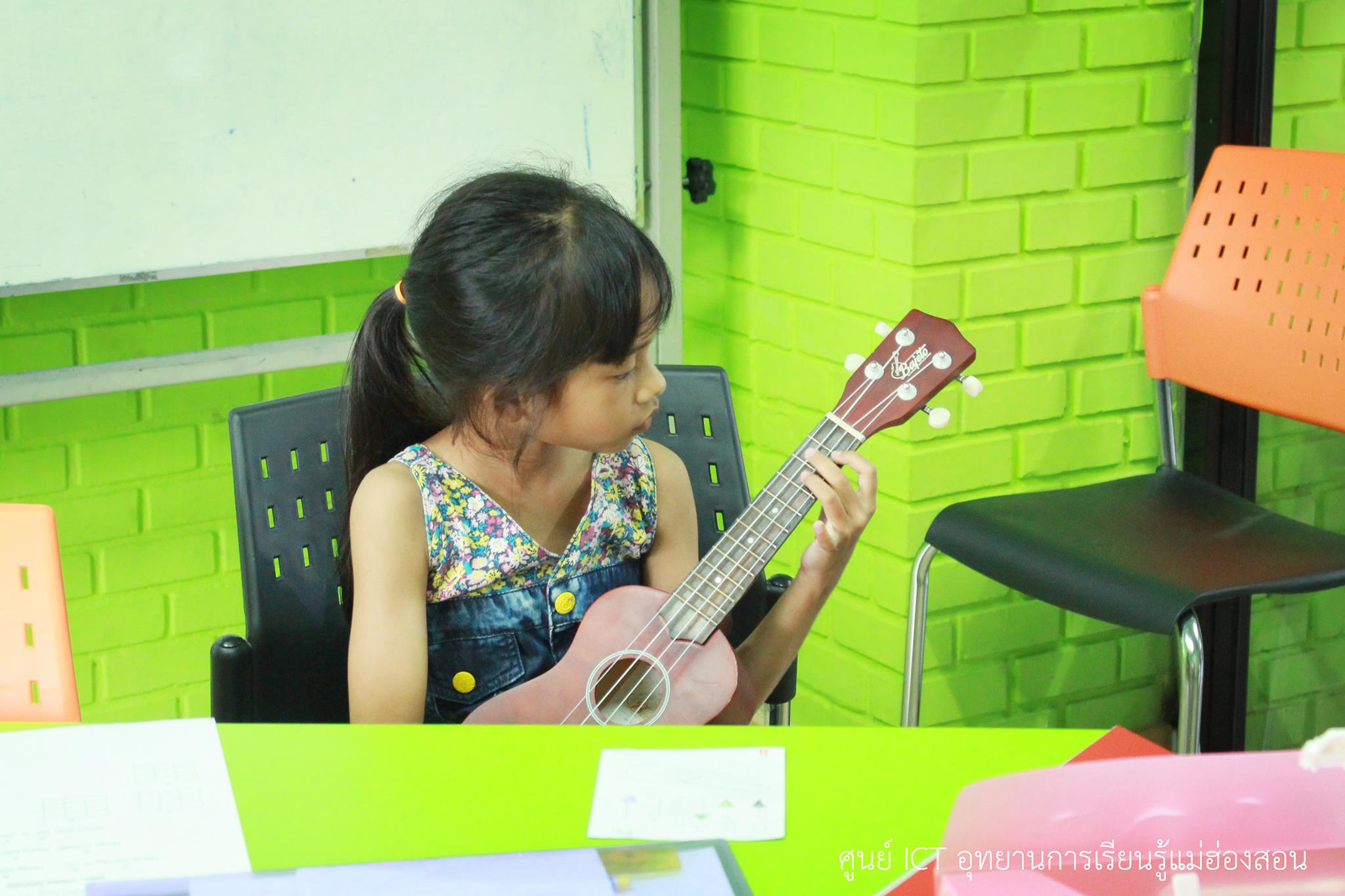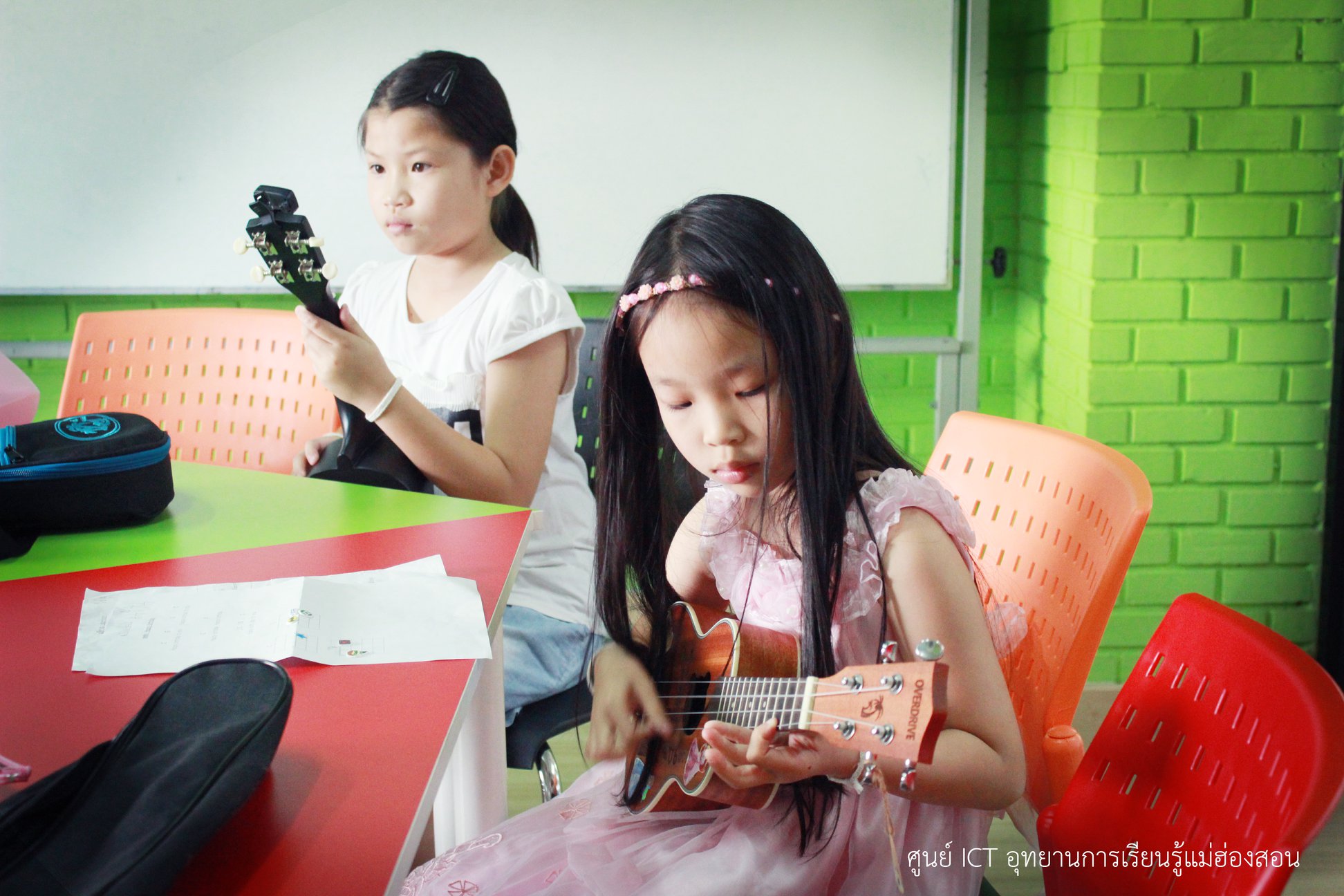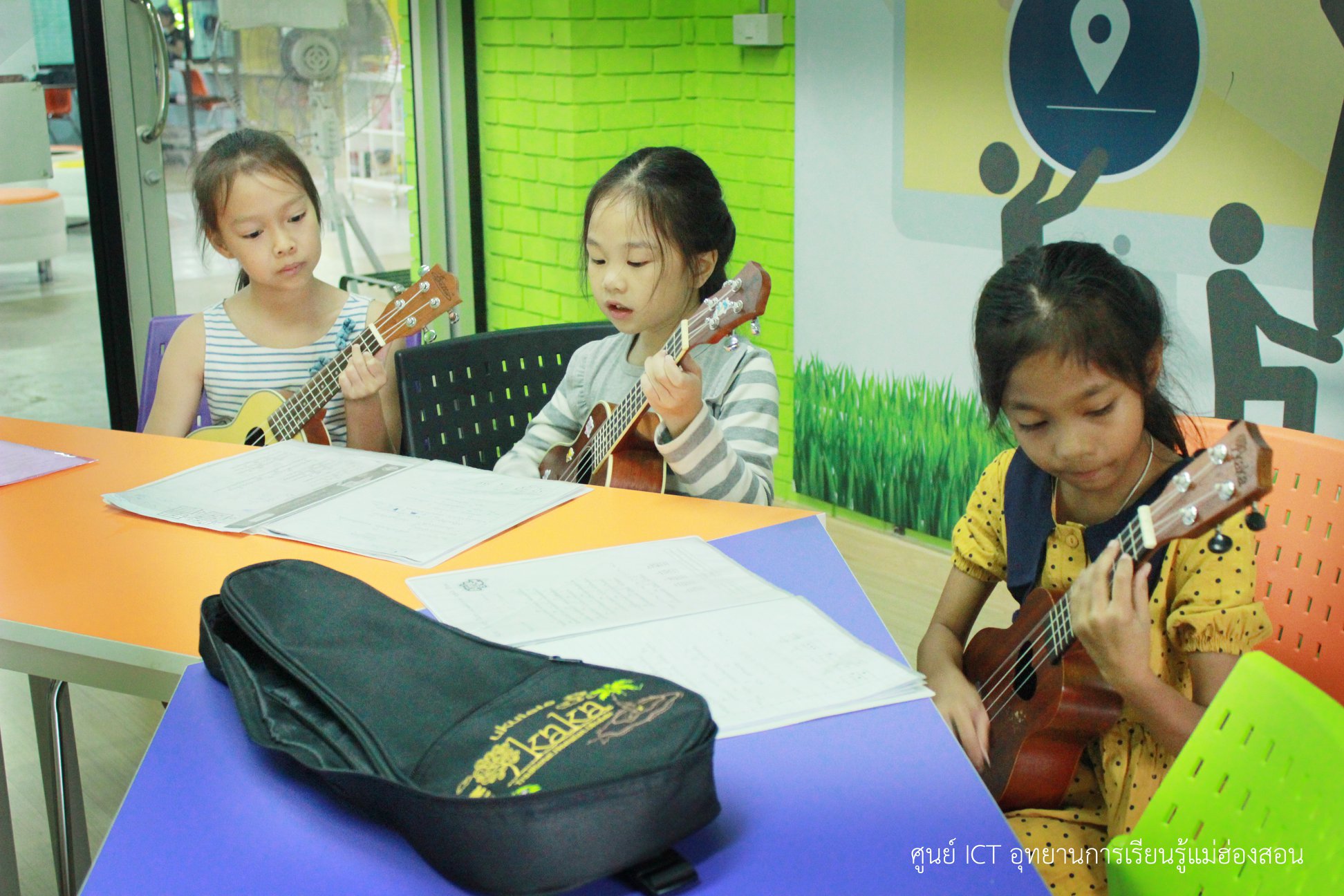 กิจกรรมเรียนดนตรีอูคูเลเล่ เล่นวันละนิด ช่วยให้จิตแจ่มใส เรียนทุกวัน ยกเว้นวันจันทร์และวันศุกร์ ณ ห้อง Study Room