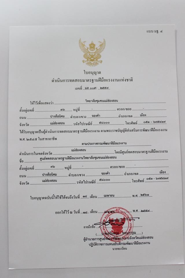 ผู้อำนวยการศูนย์พัฒนาฝีมือแรงงานจังหวัดแม่ฮ่องสอน มอบใบอนุญาตดำเนินการทดสอบมาตรฐานฝีมือแรงงานแห่งชาติ แก่วิทยาลัยชุมชนแม่ฮ่องสอน เมื่อวันที่ 19 เมษายน 59 เวลา 15.00 น. โดยจะจัดดำเนินการทดสอบ ณ ศูนย์พัฒนาทักษะและการเรียนรู้ ICT แม่ฮ่องสอน