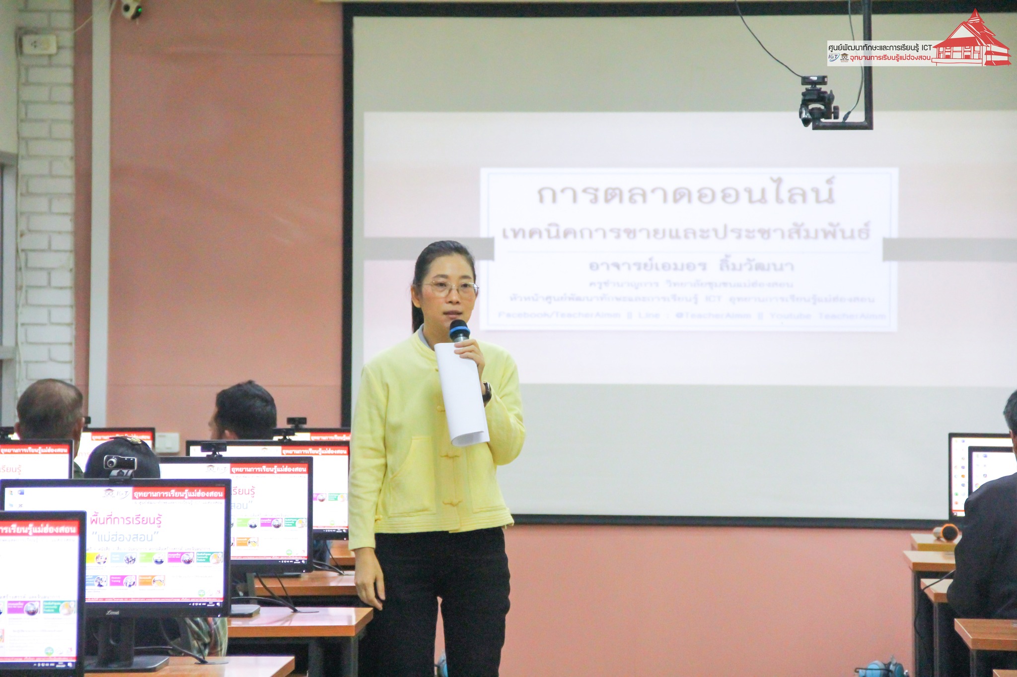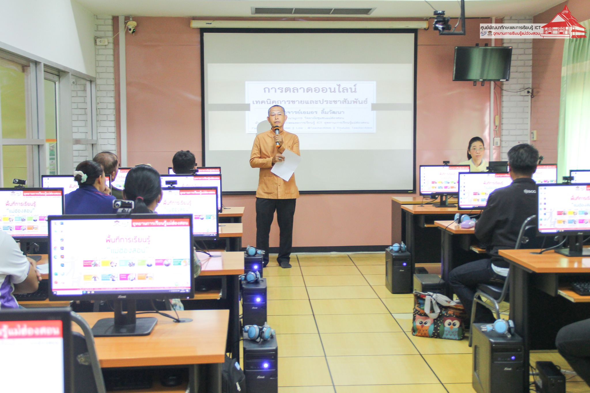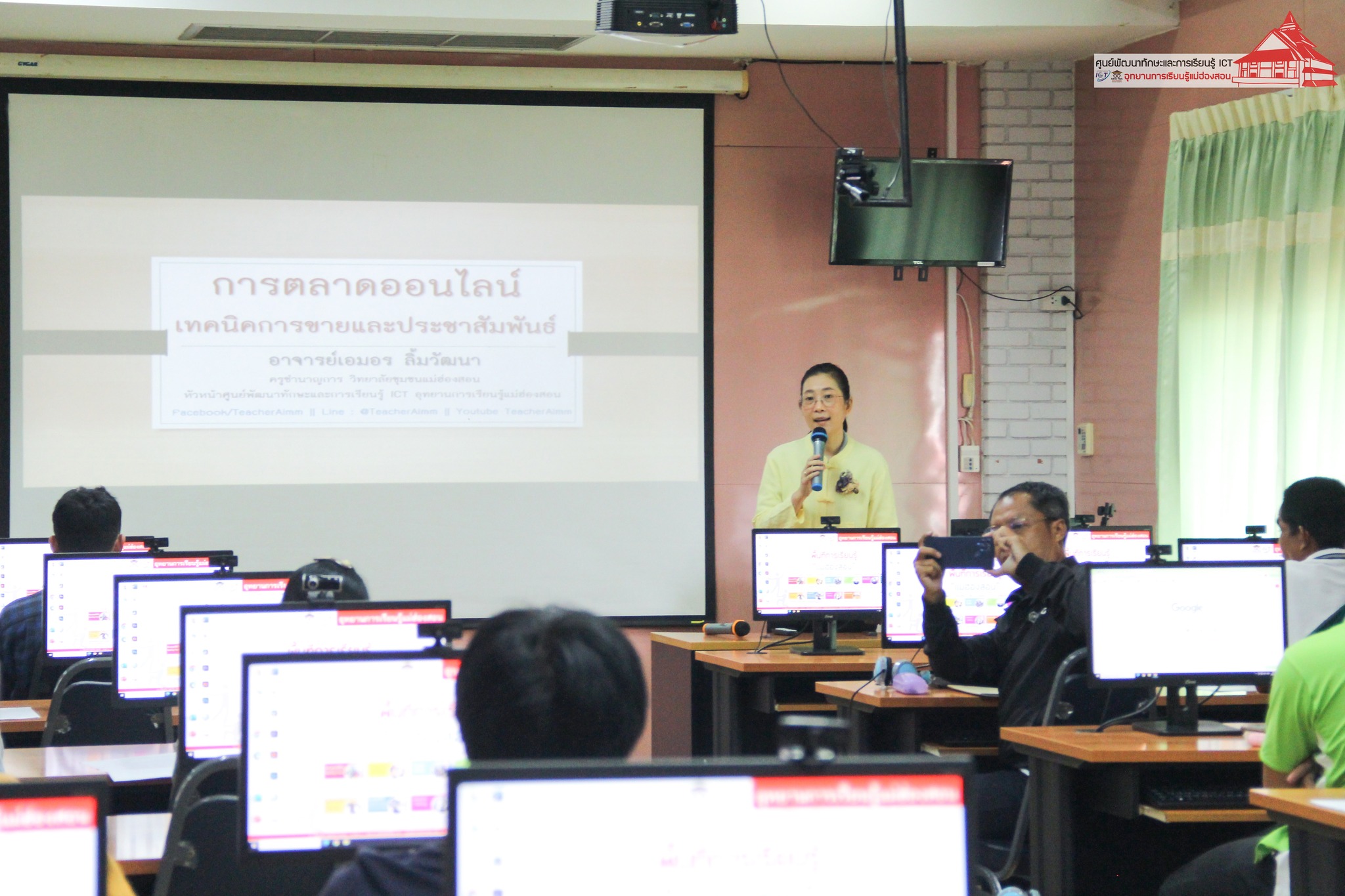 อาจารย์เอมอร ลิ้มวัฒนา ครูชำนาญการวิทยาลัยชุมชนแม่ฮ่องสอน หัวหน้าศูนย์พัฒนาทักษะและการเรียนรู้ ICT แม่ฮ่องสอน อุทยานการเรียนรู้แม่ฮ่องสอน บรรยายให้ความรู้แก่เจ้าหน้าที่ผู้รับผิดชอบงาน ศพก. ระดับอำเภอ ประธานศูนย์หลักและประธานศูนย์เครือข่าย ศพก. จำนวน 35 ราย ในหัวข้อ “การเตรียมความพร้อมสู่เกษตรต้นแบบ เรื่อง การทำตลาดออนไลน์เพื่อการจำหน่ายสินค้าเกษตร” เพื่อพัฒนาศักยภาพของประธานศูนย์หลักและประธานศูนย์เครือข่าย ศพก. ภายใต้โครงการจัดอบรมพัฒนาศักยภาพเกษตรกรต้นแบบโครงการศูนย์การเรียนรู้การเพิ่มประสิทธิภาพการผลิตสินค้าการเกษตร สำนักงานเกษตรจังหวัดแม่ฮ่องสอน เมื่อวันที่ 29 สิงหาคม 2567 ณ ห้องอบรมคอมพิวเตอร์ ศูนย์พัฒนาทักษะและการเรียนรู้ ICT แม่ฮ่องสอน อุทยานการเรียนรู้แม่ฮ่องสอน