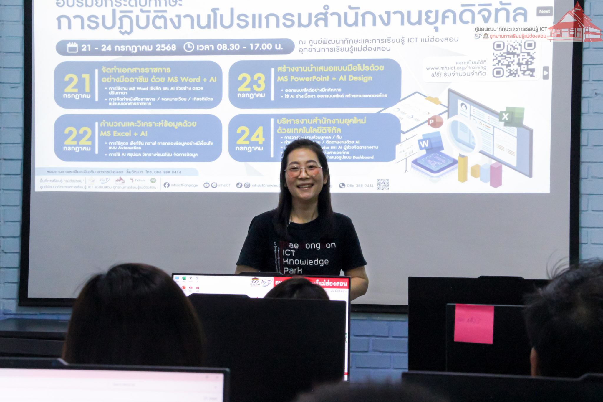 ศูนย์พัฒนาทักษะและการเรียนรู้ ICT อุทยานการเรียนรู้แม่ฮ่องสอน วิทยาลัยชุมชนแม่ฮ่องสอน จัดอบรม หลักสูตร “ยกระดับทักษะการปฏิบัติงานโปรแกรมสำนักงานยุคดิจิทัล” ให้แก่ บุคลากรภาครัฐ เอกชน และประชาชน วัตถุประสงค์เพื่อพัฒนาทักษะการใช้โปรแกรมสำนักงานร่วมกับเทคโนโลยี AI และเครื่องมือดิจิทัล เพื่อช่วยให้ทำงานได้อย่างมืออาชีพ รวดเร็ว และมีประสิทธิภาพในยุคดิจิทัล มีผู้เข้าร่วมอบรม 45 คน ในวันที่ 21 - 24 กรกฎาคม 2568 ณ ห้องอบรมคอมพิวเตอร์ ศูนย์ ICT อุทยานการเรียนรู้แม่ฮ่องสอน กล่าวต้อนรับและชี้แจงวัตถุประสงค์ โดยอาจารย์เอมอร ลิ้มวัฒนา อาจารย์วิทยาลัยชุมชนแม่ฮ่องสอน หัวหน้าศูนย์ ICT อุทยานการเรียนรู้แม่ฮ่องสอน วิทยากรโดย นายสถาพร สุริยน ครูฝึกฝีมือแรงงาน สำนักงานพัฒนาฝีมือแรงงาน จังหวัดแม่ฮ่องสอน