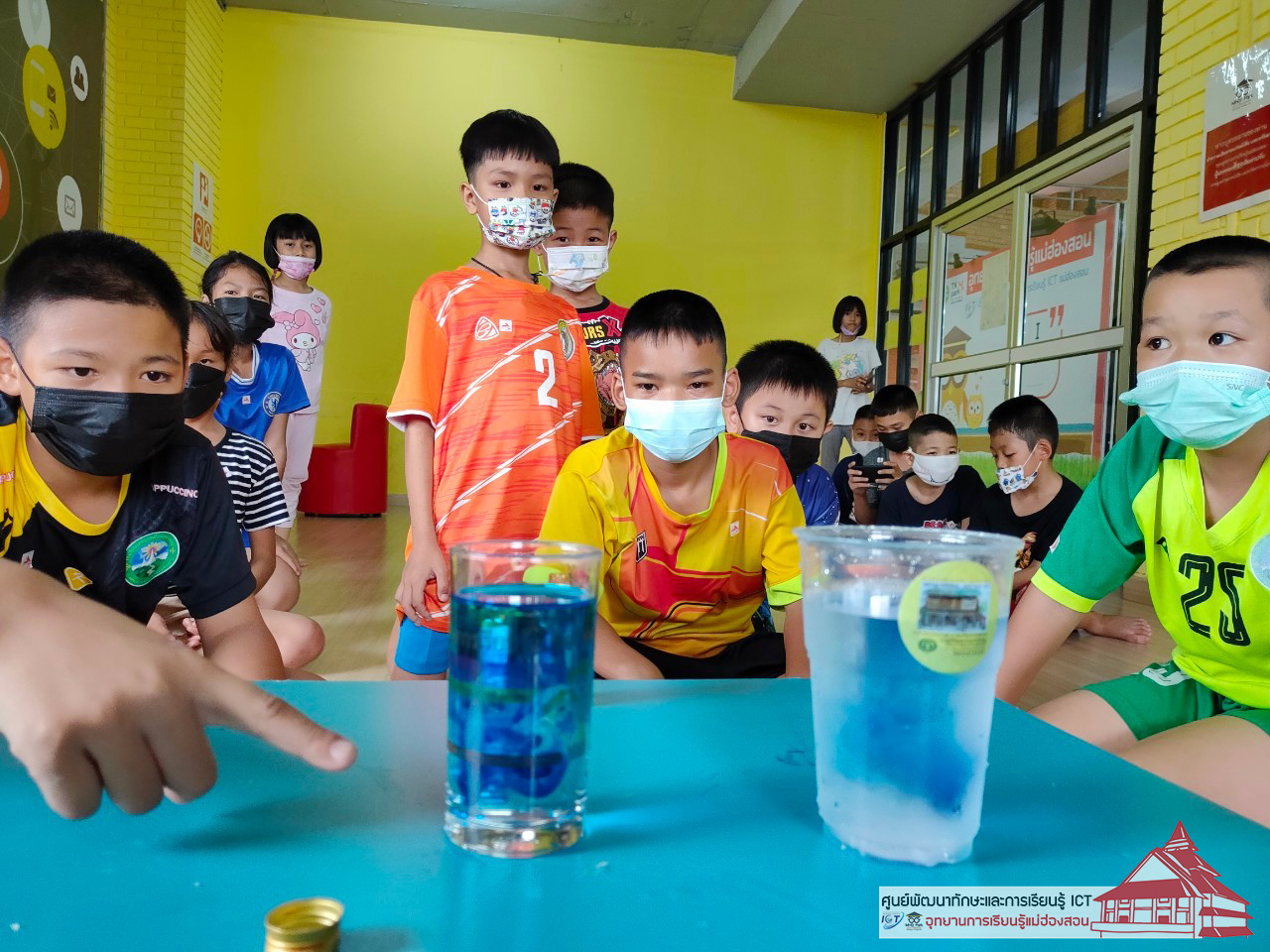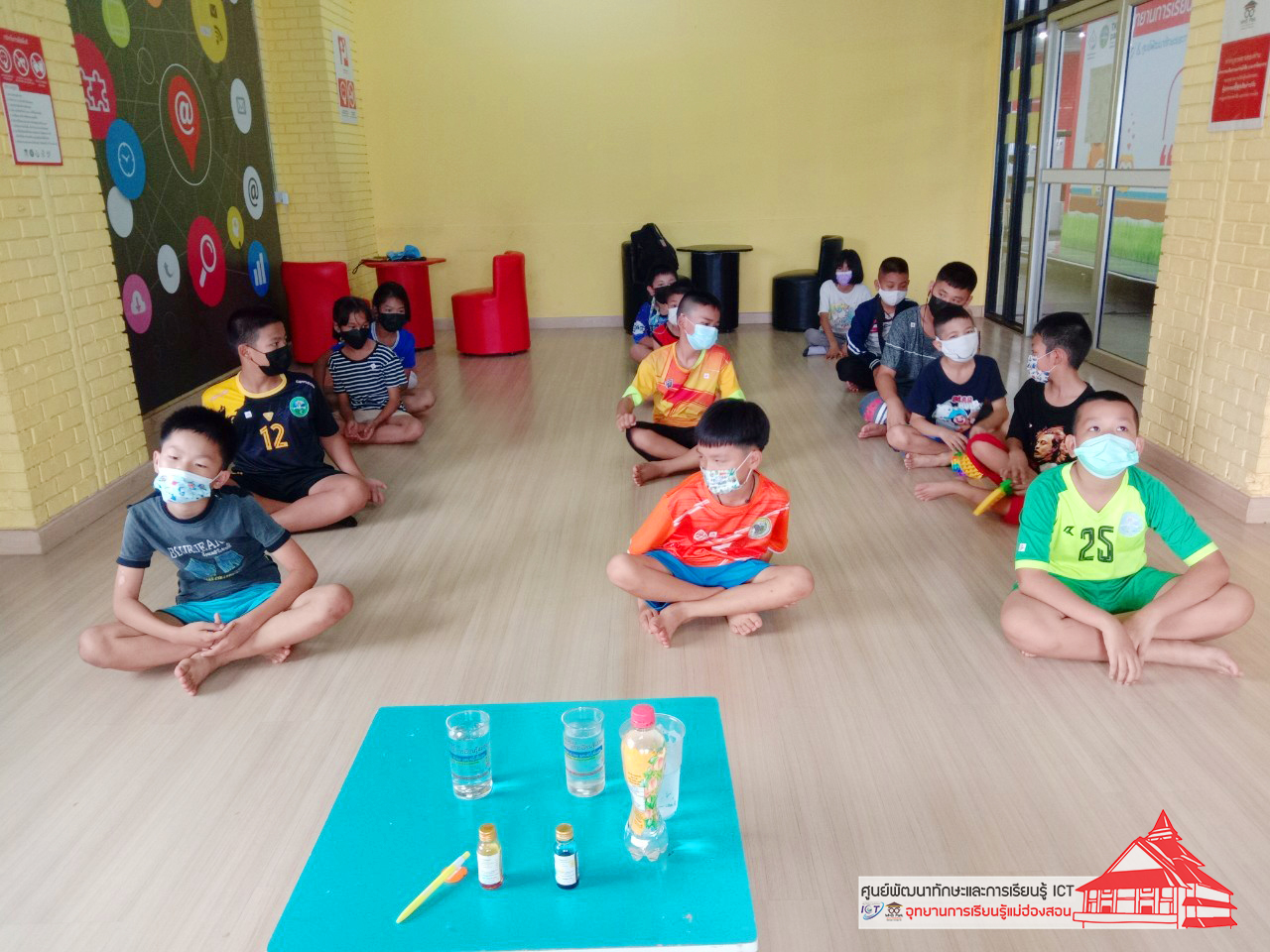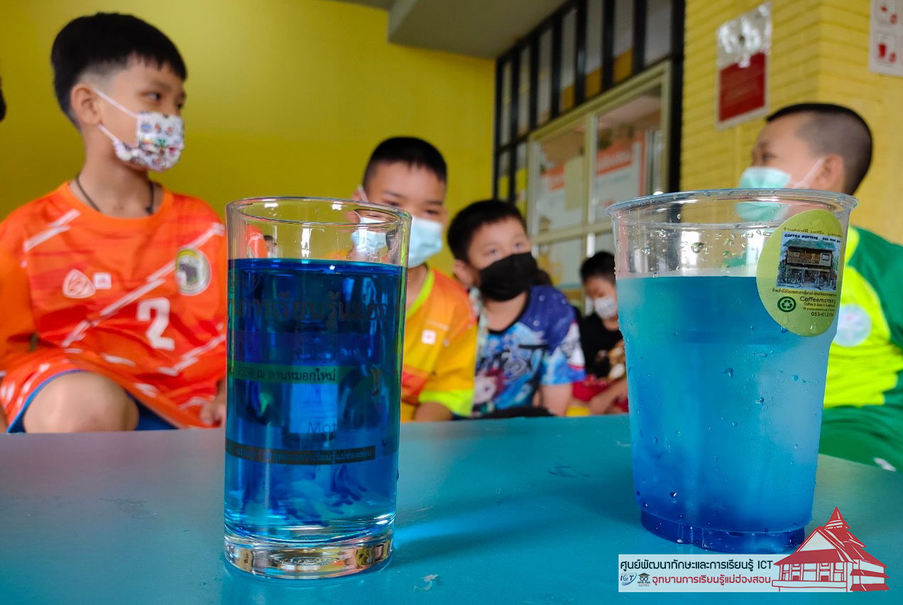 เมื่อหยดสีลงไปในแก้ว การกระจายตัวของน้ำทั้งสองแก้วก็แตกต่างกัน เด็กๆ จ้องมองด้วยความสนใจ ทุกวันเสาร์ เวลา 14.00 น. ณ ห้องเด็ก ศูนย์พัฒนาทักษะและการเรียน