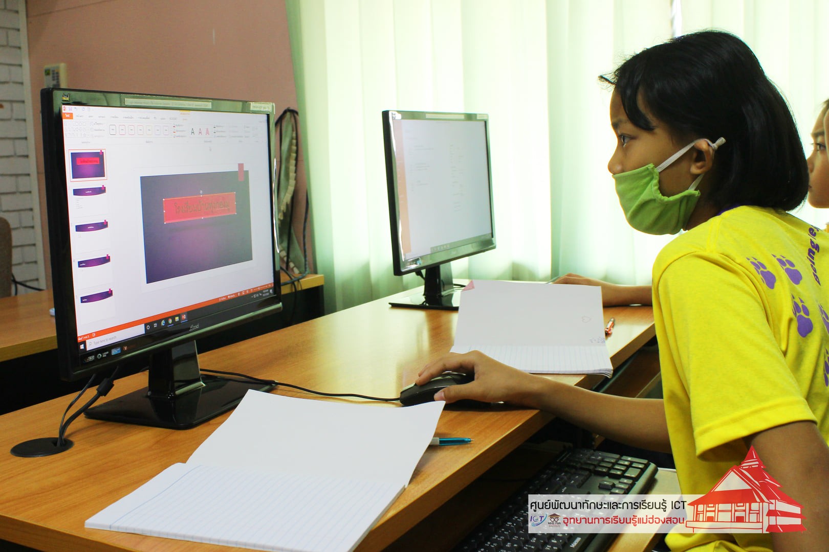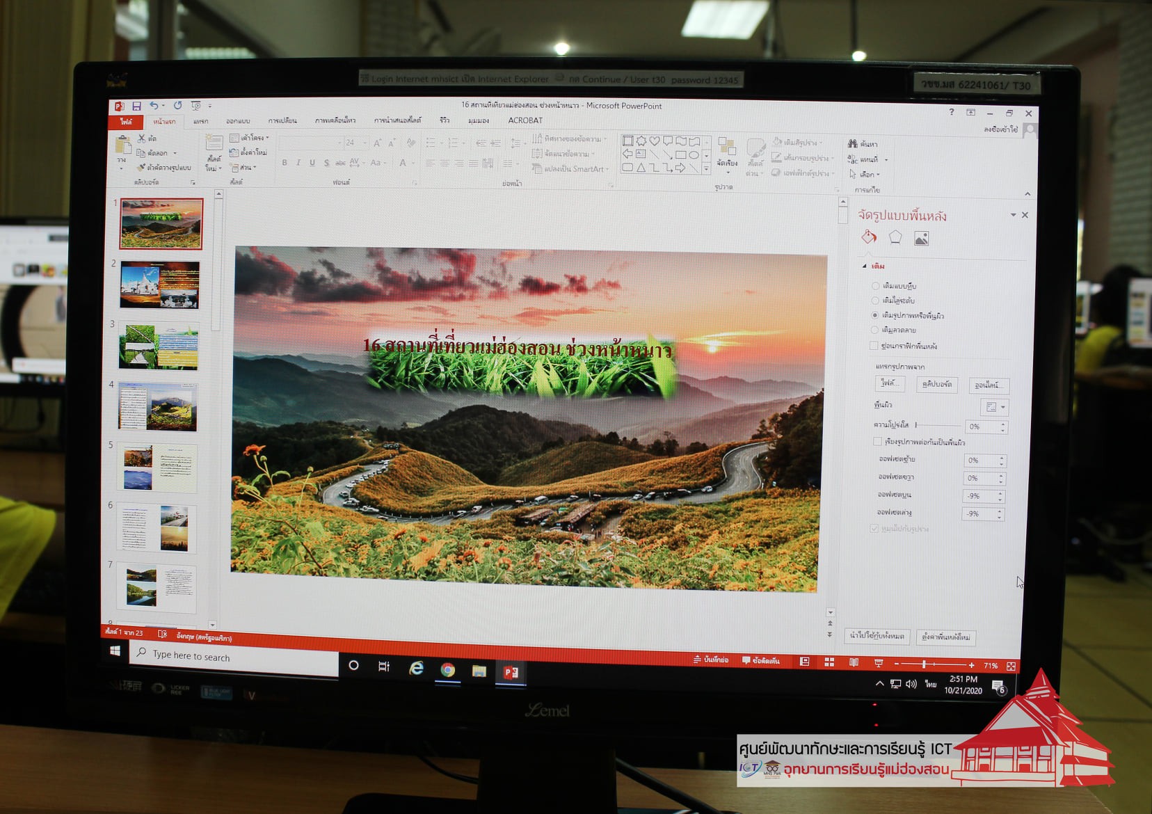 ศูนย์พัฒนาทักษะและการเรียนรู้ ICT อุทยานการเรียนรู้แม่ฮ่องสอน บริการวิชาการอบรมคอมพิวเตอร์สำหรับนักเรียน ประจำภาคเรียนที่ 1/2563 เวลา 09.00 - 16.00 น. ณ ห้องอบรมคอมพิวเตอร์ศูนย์ ICT อุทยานการเรียนรู้แม่ฮ่องสอน ได้แก่ การใช้งานโปรแกรม Microsoft Powerpoint โรงเรียนบ้านทุ่งกองมู ชั้น ป.4 - ป.6 จำนวน 33 คน วันที่ 21 ตุลาคม 2563