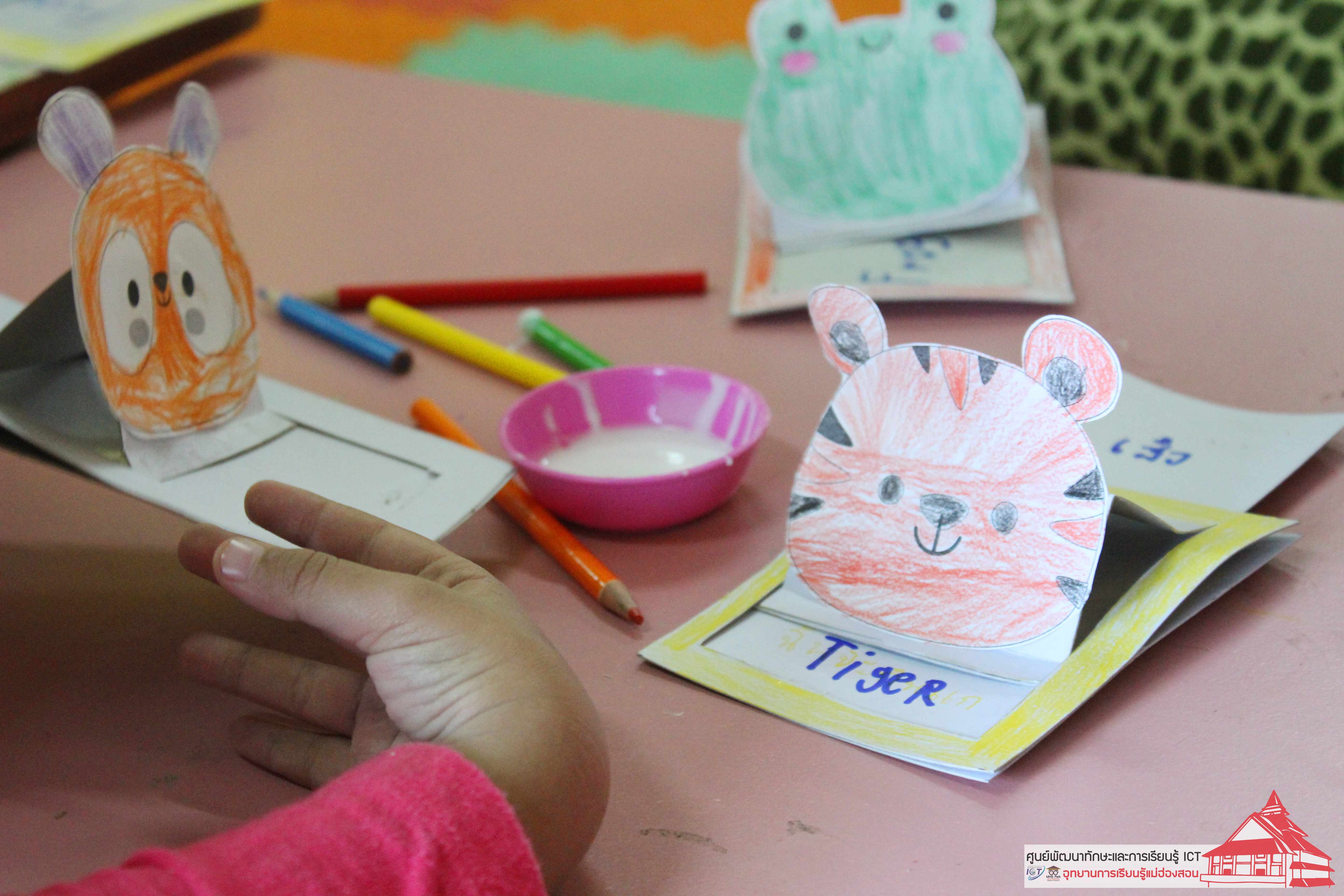 3.ให้ติดรูปต่างต่างพร้อมให ้เด็กเขียนคำศัพท์ไทย - อังกฤษ พร้อมตกแต่งภาพระบายสีให้สว ยงาม