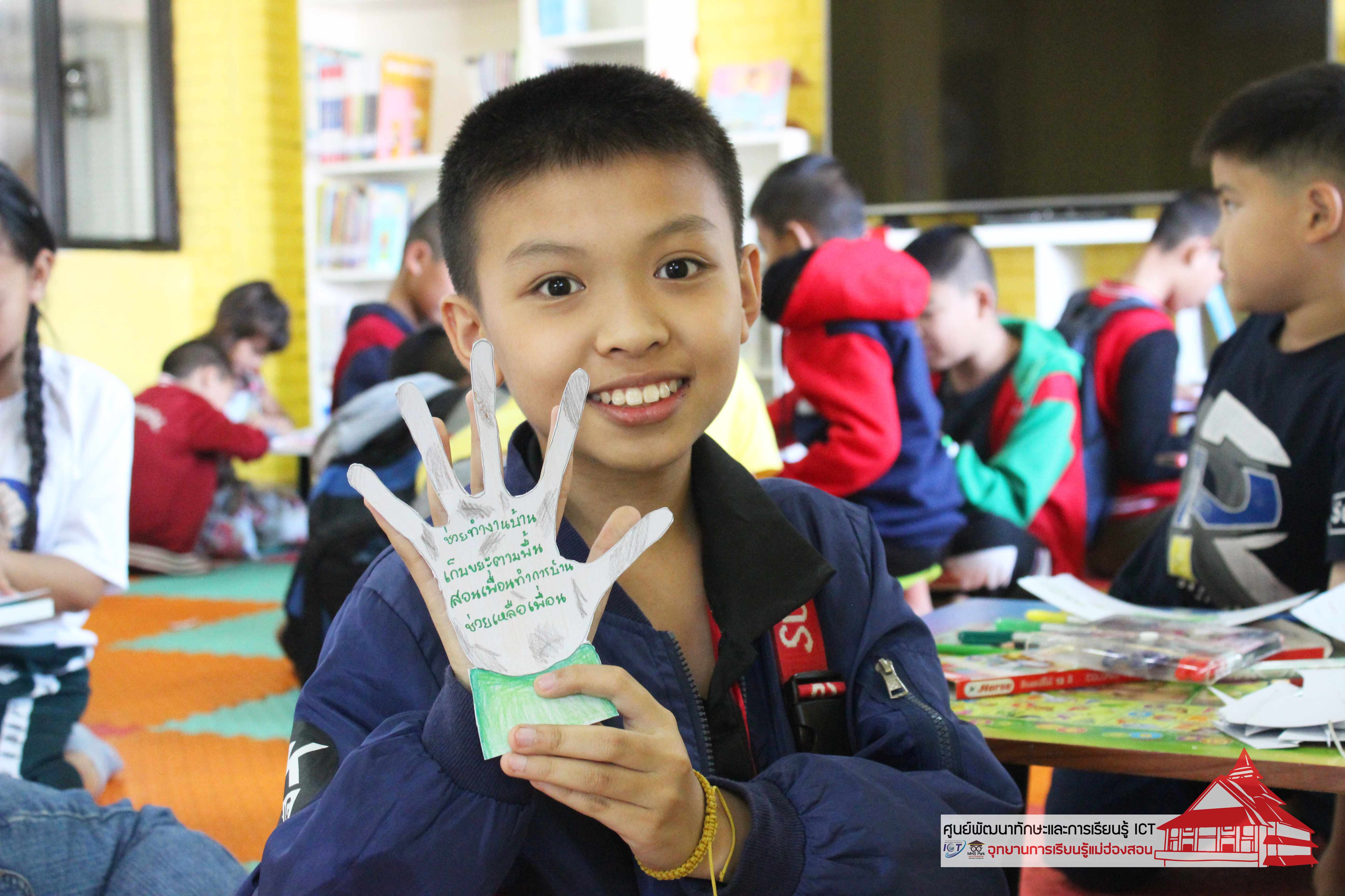 เพื่อส่งเสริมทักษะด้านศิลป ะ ความคิดสร้างสรรค์ และเสริมสร้างความคิดและจิต สำนึก โดยการนำมือทาบลงบนกระดาษแข ็งแล้ววาดตามรอยมือ แล้วเขียนว่าจะทำความดีอะไร ในมือที่วาดไว้ พร้อมระบายสีตกแต่งให้สวยงา ม
