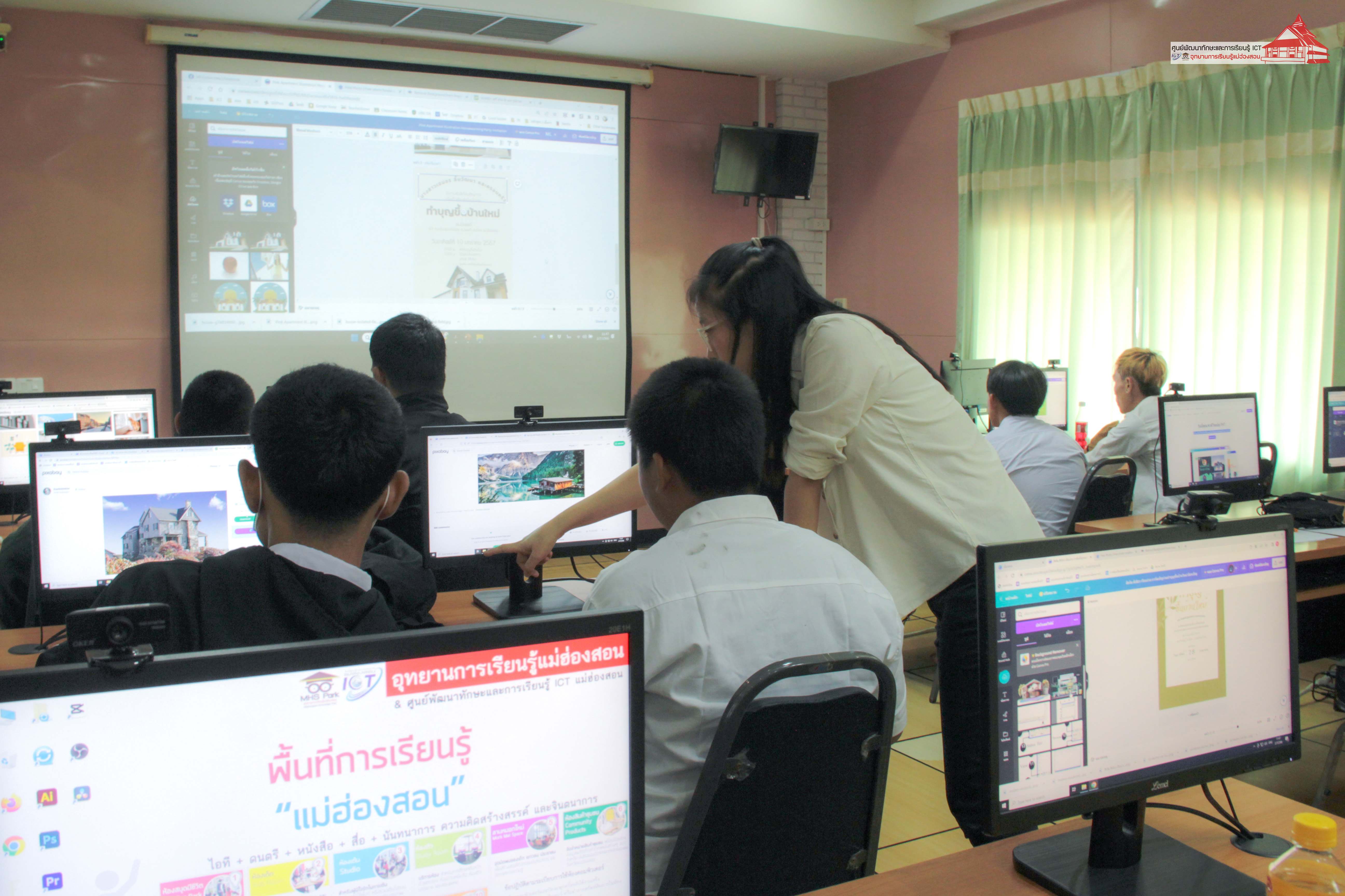 อาจารย์เอมอร ลิ้มวัฒนา หัวหน้าศูนย์พัฒนาทักษะและการเรียนรู้ ICT แม่ฮ่องสอน อุทยานการเรียนรู้แม่ฮ่องสอน บรรยาย ให้ความรู้ พร้อมฝึกปฏิบัติ การใช้งาน Canva สำหรับการออกแบบสิ่งพิมพ์ดิจิทัล และ งานนำเสนอ เมื่อวันที่ 2 กรกฎาคม 2566 แก่นักศึกษา ระดับชั้น ปวช. ศูนย์ส่งเสริมการเรียนรู้จังหวัดแม่ฮ่องสอน ณ ห้องฝึกอบรมคอมพิวเตอร์ ศูนย์ ICT อุทยานการเรียนรู้แม่ฮ่องสอน
