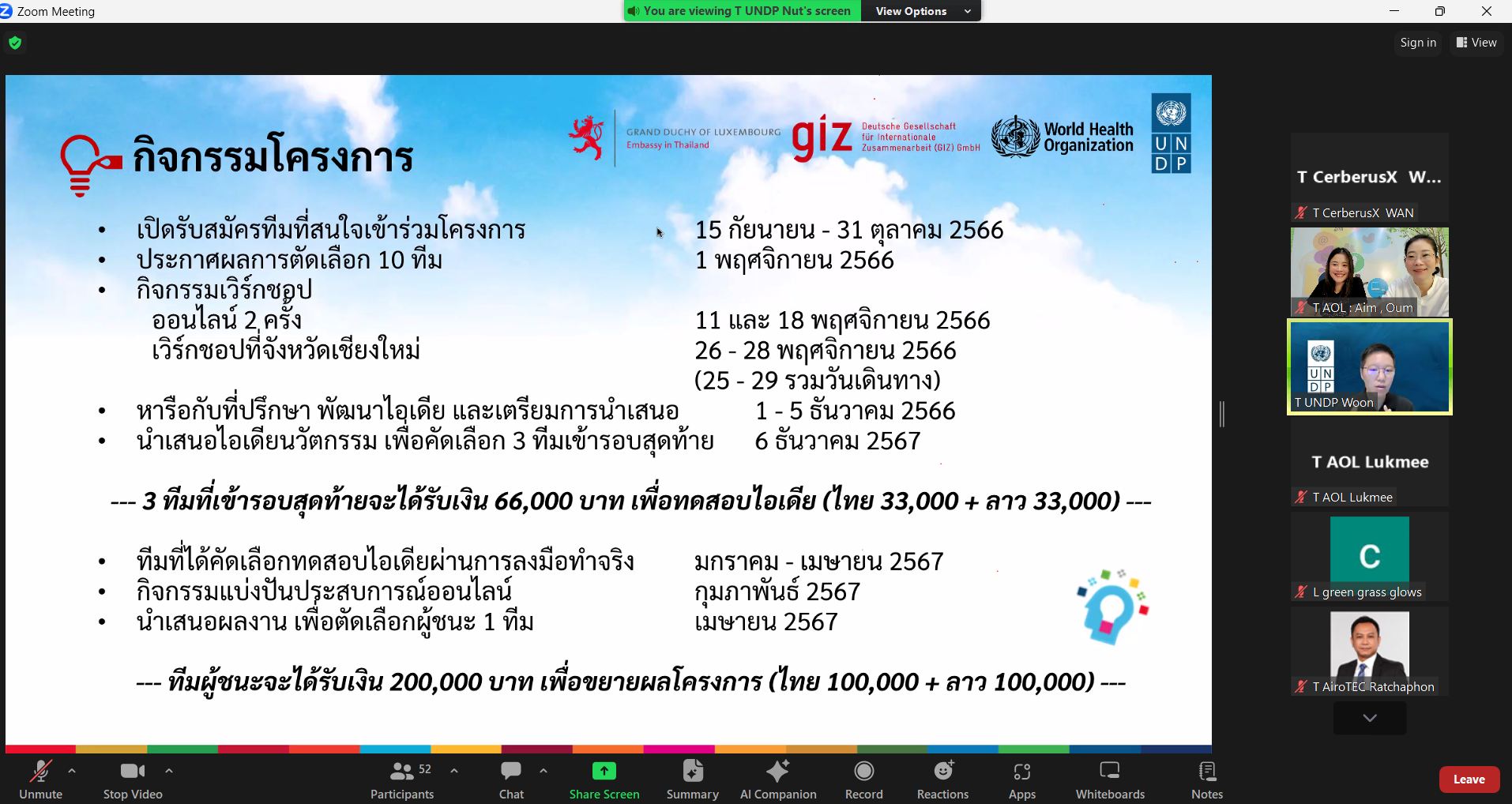 สำหรับครั้งนี้ วันที่ 11 พฤศจิกายน 2566 เป็นการพบกันครั้งแรกของโครงการเพื่อทำ Workshop Online ผ่าน ระบบ zoom meeting ในการแลกเปลี่ยนพูดคุยและทำความรู้จักกัน และรับฟังแนวทางของแต่ละทีมในการจับคู่เพื่อเลือกทีมดำเนินงานนในครั้งต่อไป