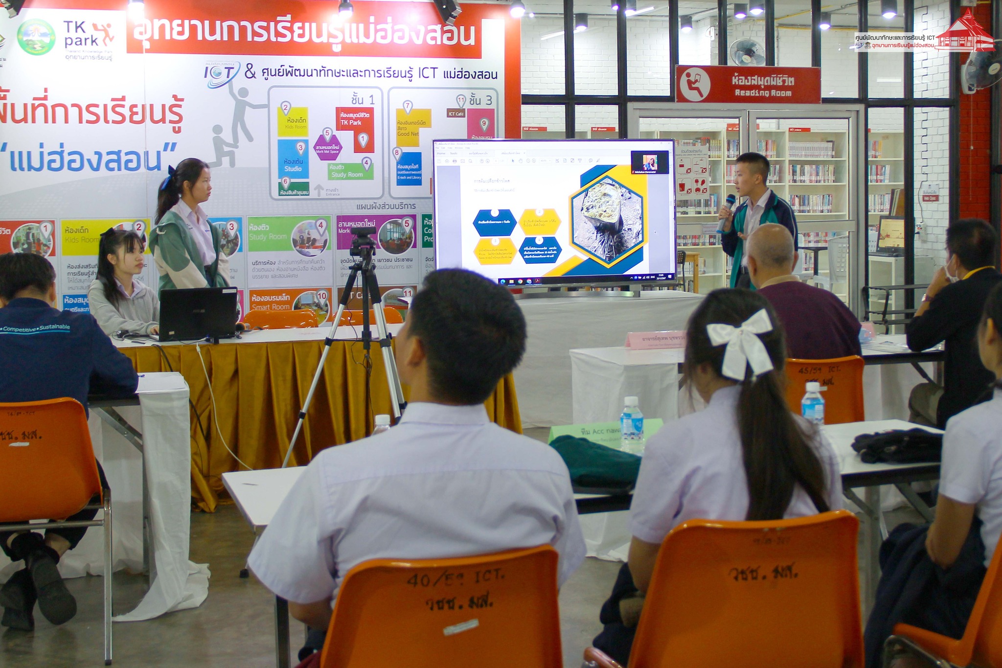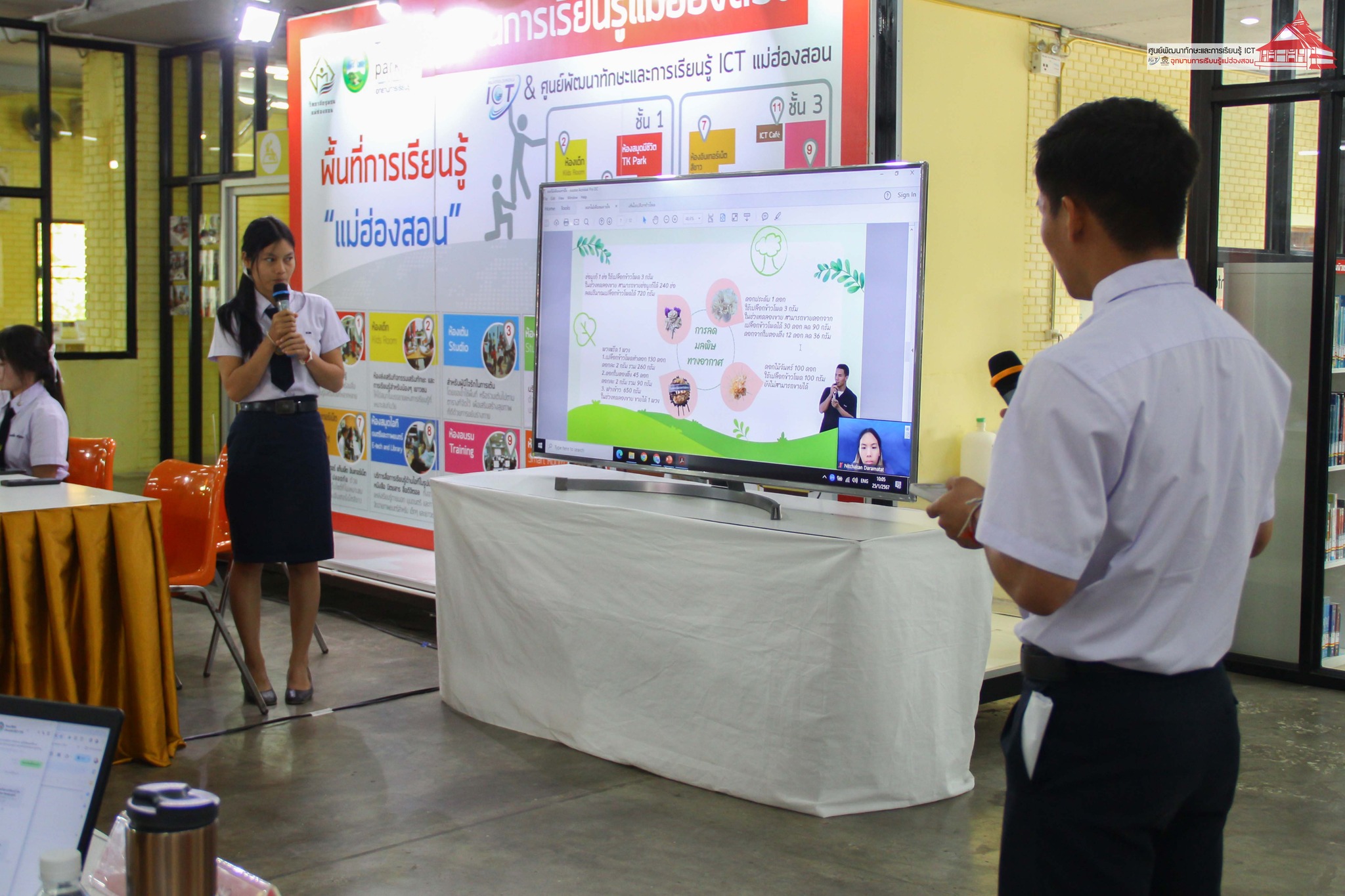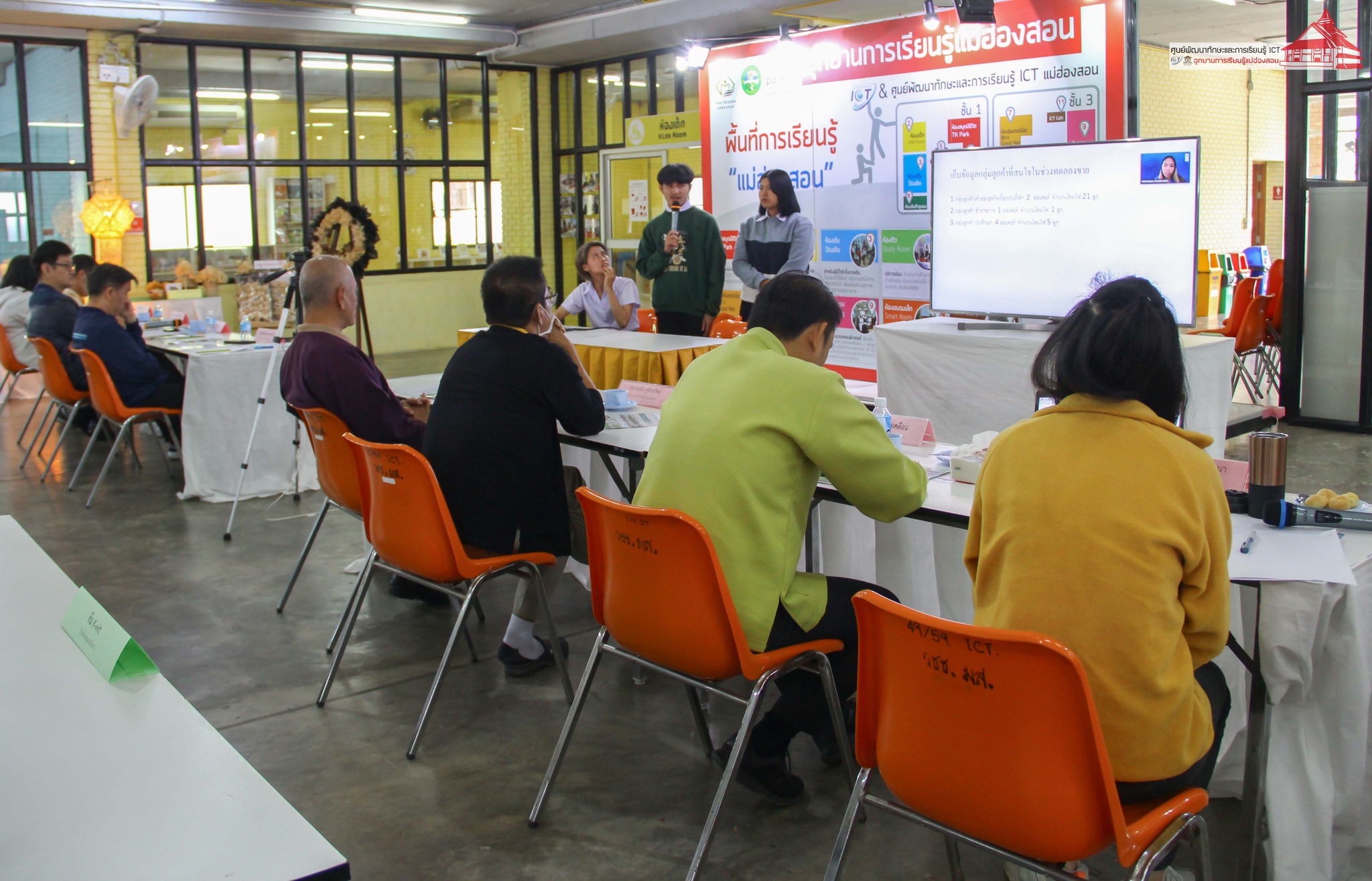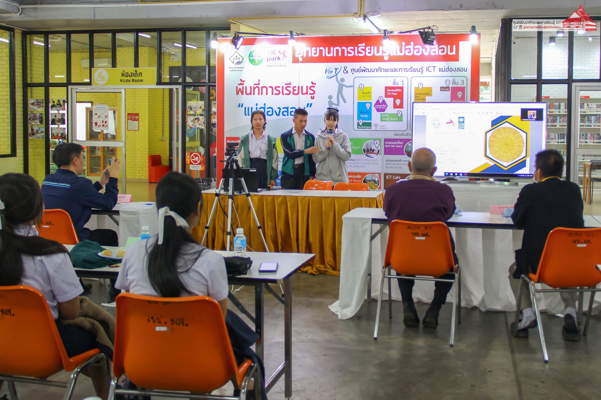 การนำเสนอในครั้งนี้ มีอาจารย์สุเทพ นุชทรวง ประธานสภาวิทยาลัยชุมชนแม่ฮ่องสอน, นายคมสัน คูสินทรัพย์ ผู้อำนวยการวิทยาลัยชุมชนแม่ฮ่องสอน, นายฤทธิพร ไหวเคลื่อน เลขานายกเทศมนตรี เทศบาลเมืองแม่ฮ่องสอน ร่วมรับฟังการนำเสนอ / คณะกรรมตัดสินการแข่งขันโดย คุณบัณฑิต นิลอุดมศักดิ์ ประธานหอการค้าจังหวัดแม่ฮ่องสอน, นางสาวนันทัชพร ก่าหยั่นนะ ผู้จัดการ Food forest maehongson กรรมการบริษัทประชารัฐรักสามัคคีแม่ฮ่องสอน และสมาชิกหอการค้าจังหวัดแม่ฮ่องสอน, คุณนิรันดร์ วิชัยสกุล เจ้าของร้านปาด็อง เสื้อยืด แม่ฮ่องสอน, นายชาญชัย ดารารัตติกาล ผู้อำนวยการกลุ่มงานยุทธศาสตร์และข้อมูลเพื่อการพัฒนาจังหวัด สำนักงานจังหวัดแม่ฮ่องสอน, และคุณณิชกานต์ ธรมธัช เจ้าหน้าที่งานเยาวชนและนวัตกรรมเพื่อสังคม UNDP Thailand ดำเนินกิจกรรม โดย อาจารย์เอมอร ลิ้มวัฒนา หัวหน้าศูนย์ฯ และบุคลากร ศูนย์ ICT อุทยานการเรียนรู้แม่ฮ่องสอน