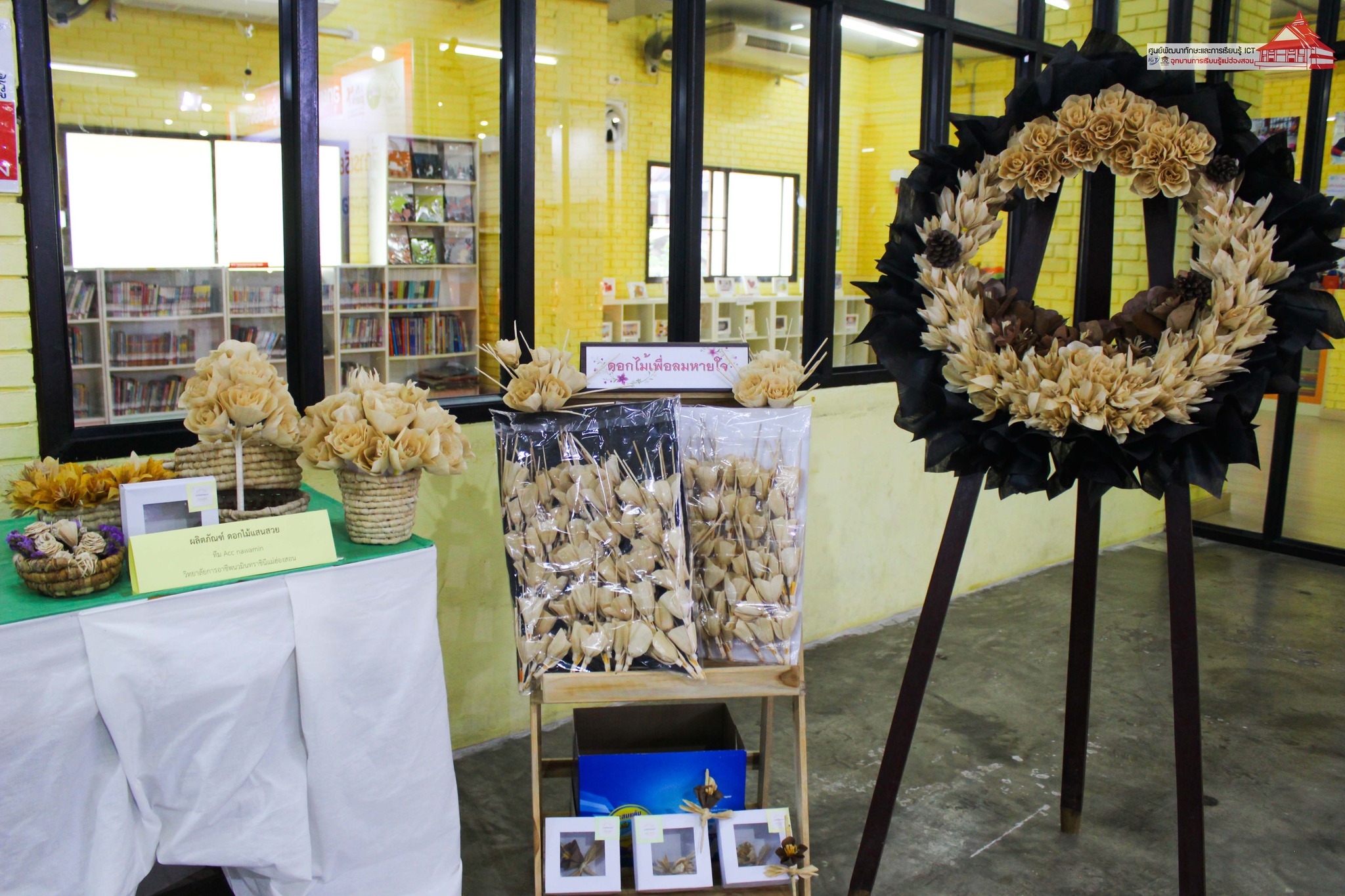ทีม Acc nawamin วิทยาลัยการอาชีพนวมินทราชินีแม่ฮ่องสอน ผลิตภัณฑ์ดอกไม้เพื่อลมหายใจ พวงหรีด / ดอกไม้จันทร์ / ช่อบูแก้ / ช่อดอกไม้ จากเปลือกข้าวโพด และใบตองตึง